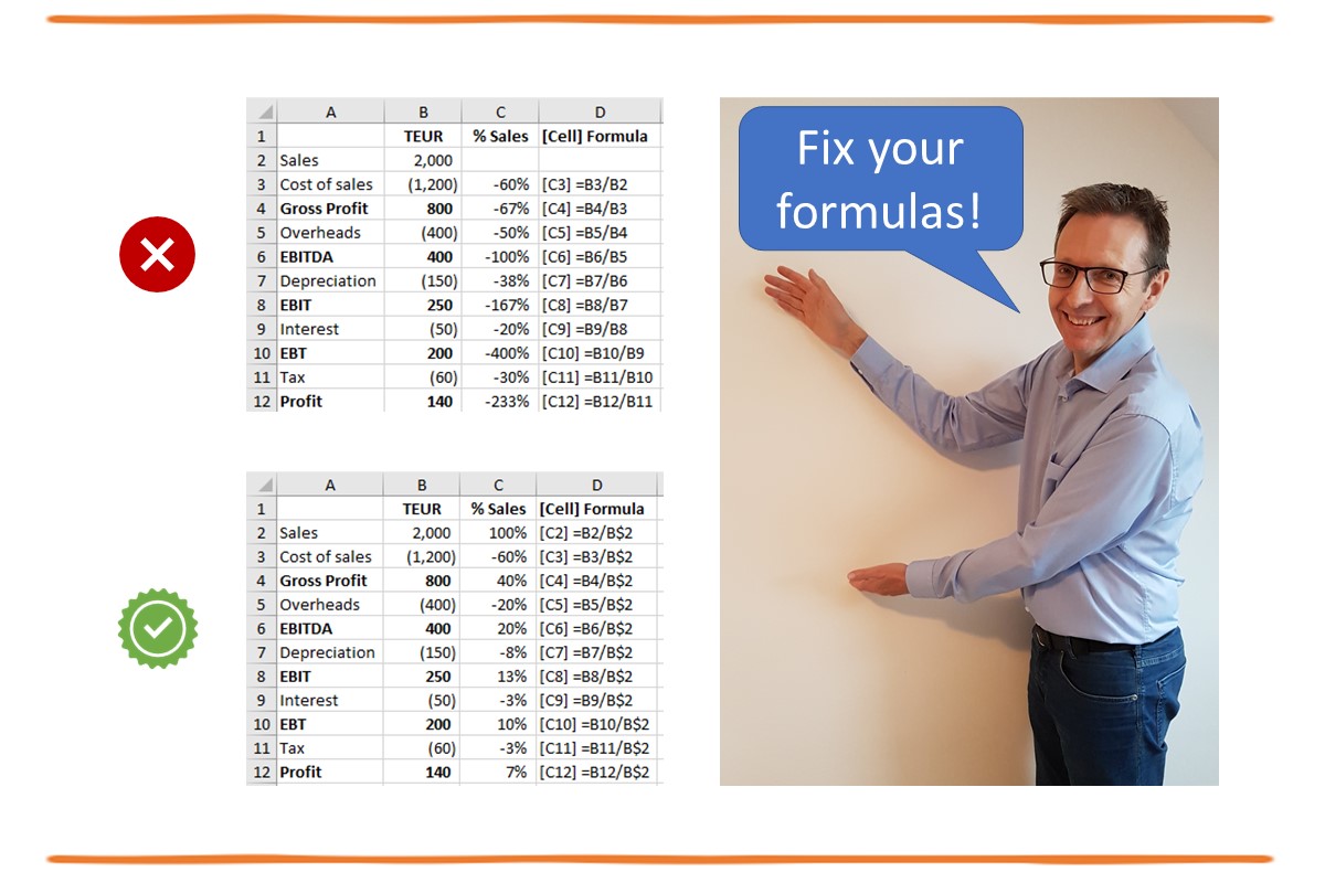 ❌😣 A client wanted to calculate the percentage of sales for all P&L lines. Such a ‘common size P&L' is useful for comparisons e.g., of years or of different companies. His first formula in row 3 (see screenshot above) gave a correct result. But when he copied this down, the denominator in each formula referred to the row above and not the sales figure in row 2.